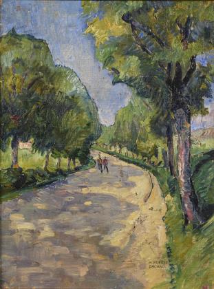 Breite Allee mit Bäumen und zwei Personen im Sonnenschein