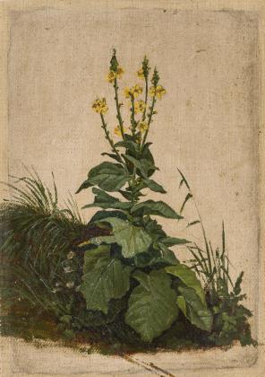 Königskerze auf einem Rasenstück vor neutralem Hintergrund