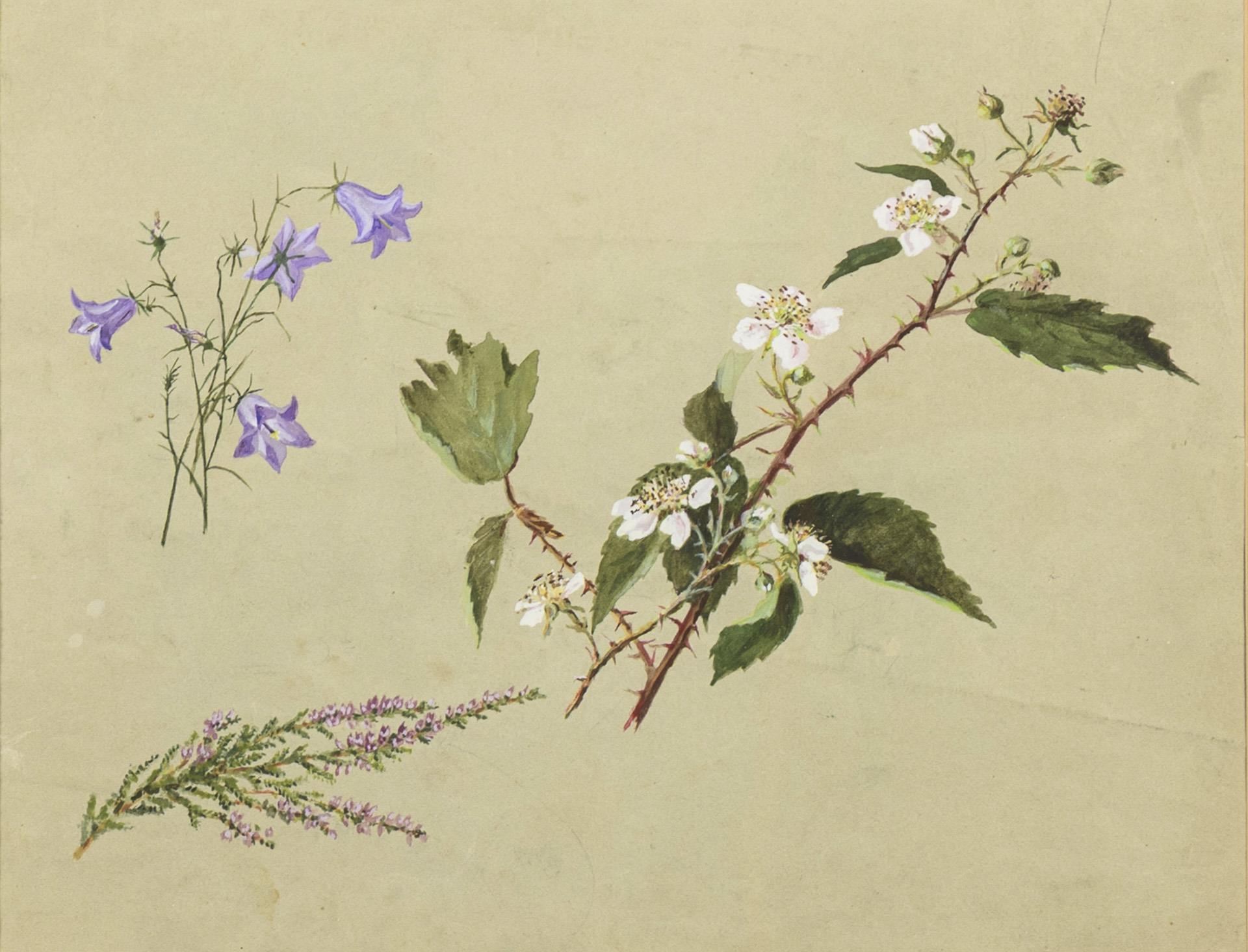 Darstellungen von Brombeerranken, Erika und Glockenblumen auf neutralem Hintergrund