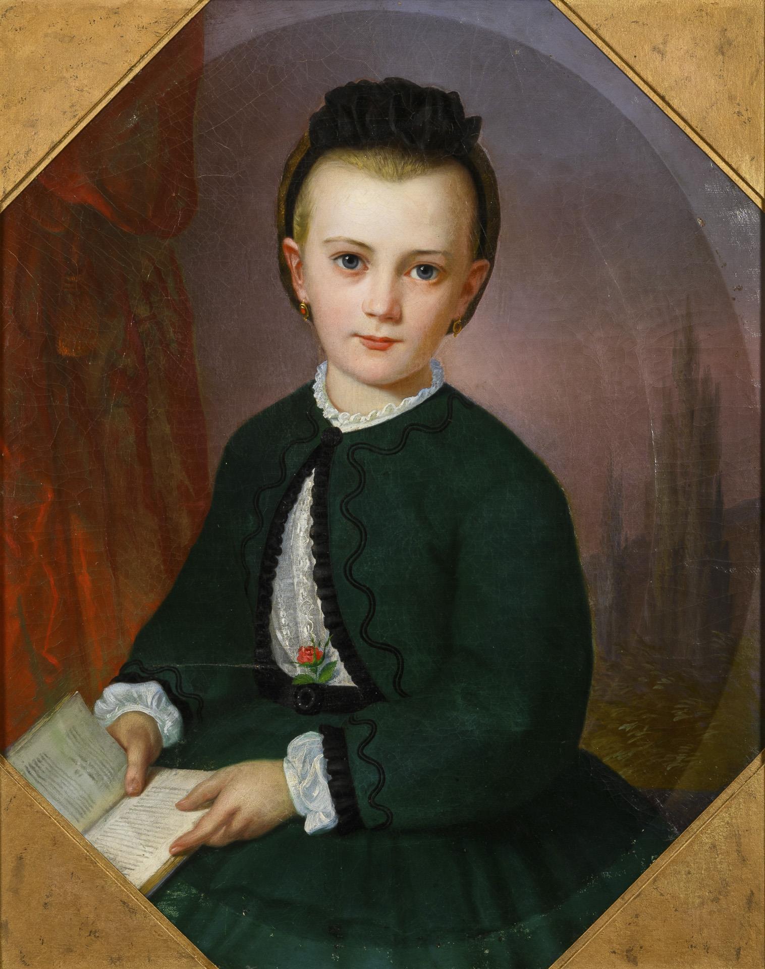 Porträt eines Mädchens im grünen Kleid mit einem geöffneten Buch vor eine Landschaft