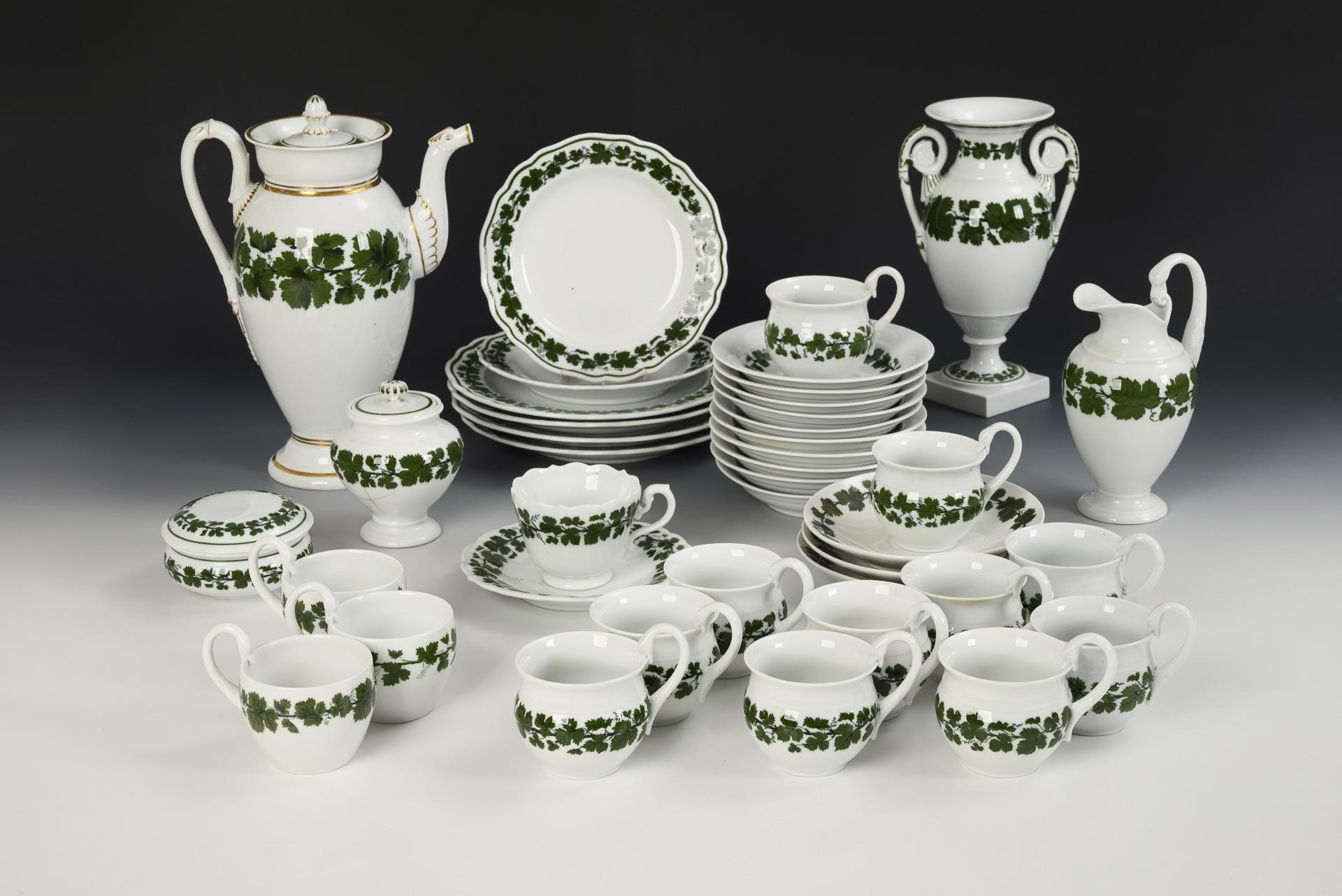 45 Teile. Kaffeekanne (H 23,5 cm), Milchkännchen, 2 Zuckerdosen (H 9,5 und 11,5 cm), 12 Tassen mit 12 Untertassen, 13 Kuchenteller, 1 Kredenzteller (Ø 27 cm), 1 Tafelaufsatz (H 12,5 cm), 1 Vase (H 12,5 cm) und 1 Schale (Ø 16 cm)