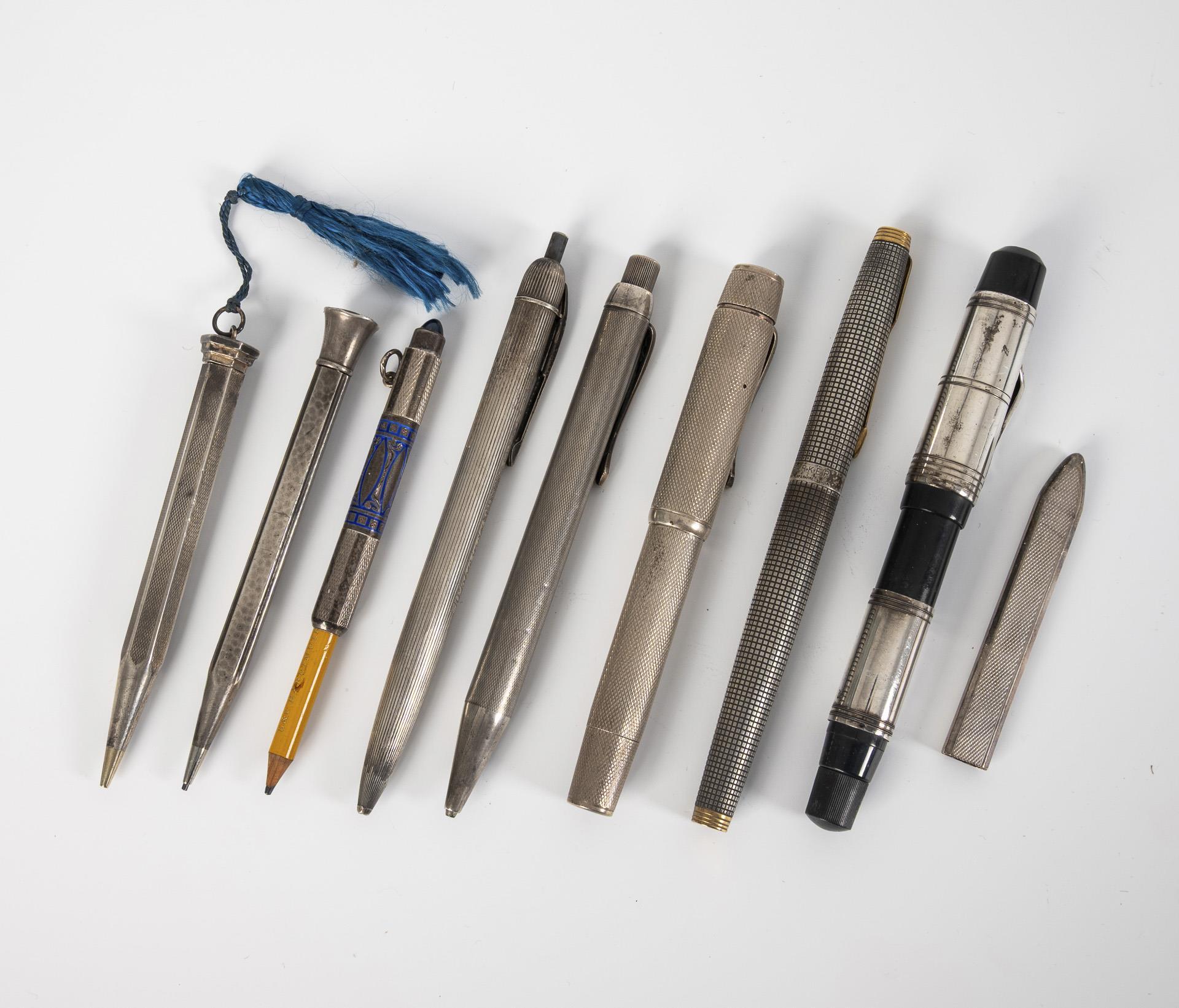 9 Schreibgeräte mit Silberhüllen.