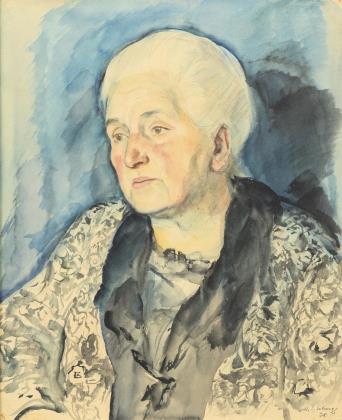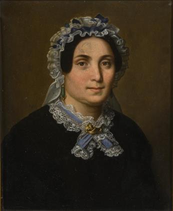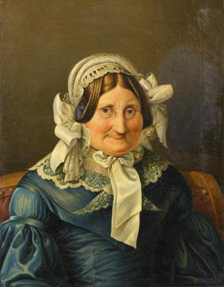 Porträt einer älteren Frau im blauen Kleid mit weißer Spitzenhaube