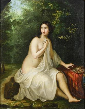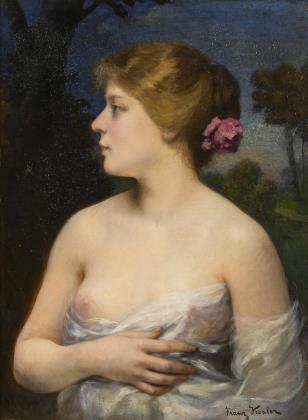 Porträt einer jungen Frau mit teils entblößtem Busen und zur Seite gerichtetem Blick vor einer Wald und Wiesenlandschaft