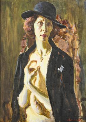 In Anlehnung an die Neue Sachlichkeit gemalte ältere Frau mit entblößtem Busen auf einem Stuhl