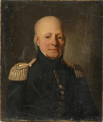 Porträt des alten Mannes in dunkelgrüner Uniform mit silbernen Epauletten