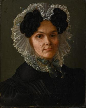 Porträt einer jungen Frau in schwarzem Kleid mit fein gemalter Spitzenhaube