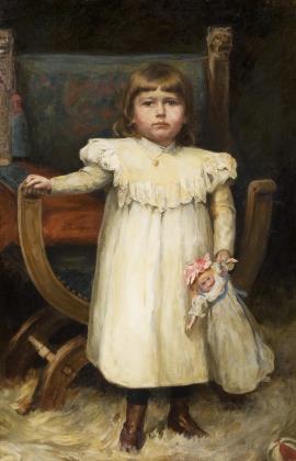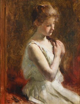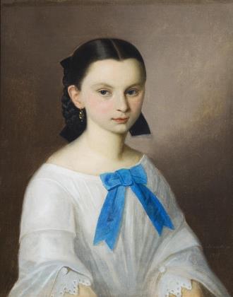 Bildnis eines Mädchens im hellen Kleid vor neutralem Hintergrund
