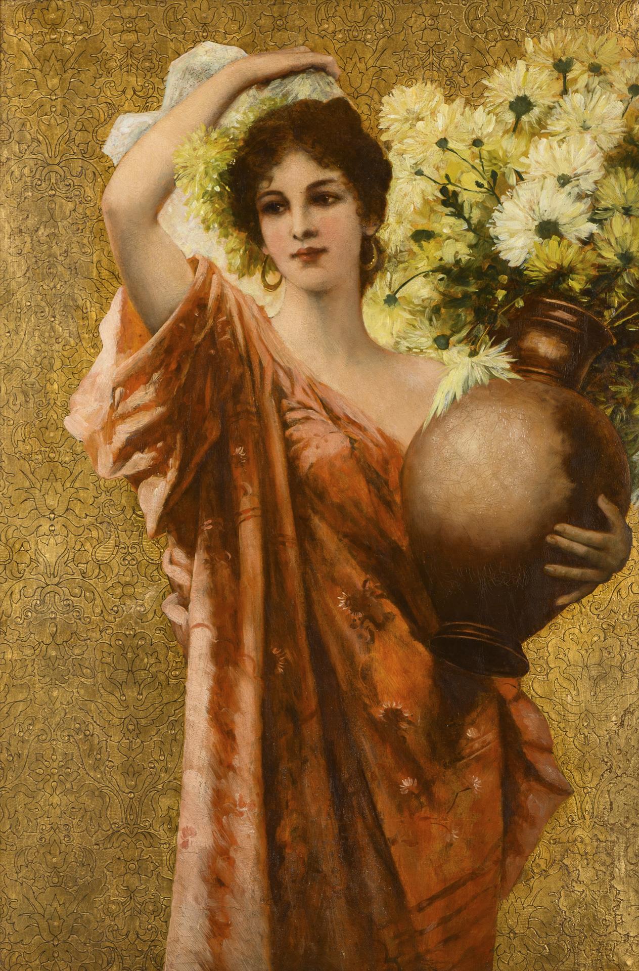 In ein antikisierendes Gewand gekleidete junge Frau mit großer Vase und einem Strauß Margeriten