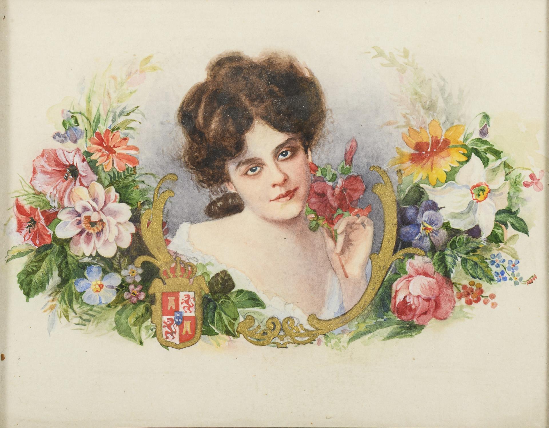 Porträt einer jungen Frau zwischen Blumen mit dem in leicht stilisierter Form dargestellten, bekrönten kleinen königlichen Wappen Spaniens (zwischen 1874 - 1930)