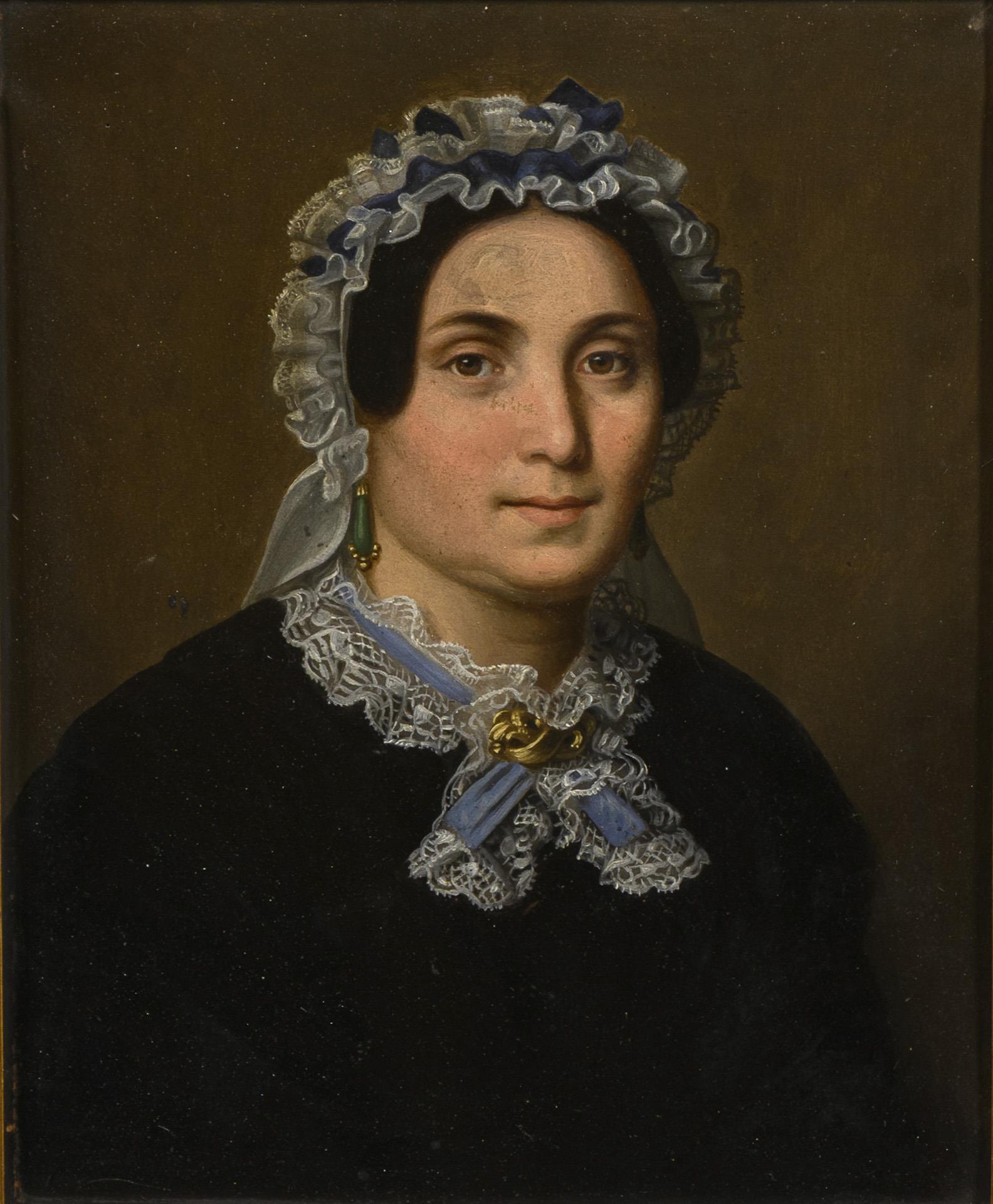 Porträt einer jungen Frau in schwarzem Kleid mit fein gemalter Spitzenhaube
