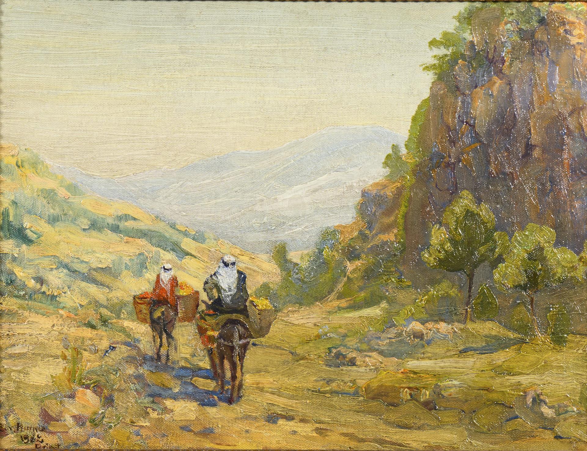 Zwei Reiter mit voll beladenen Körben auf einem Pfad in den Bergen im Sonnenschein
