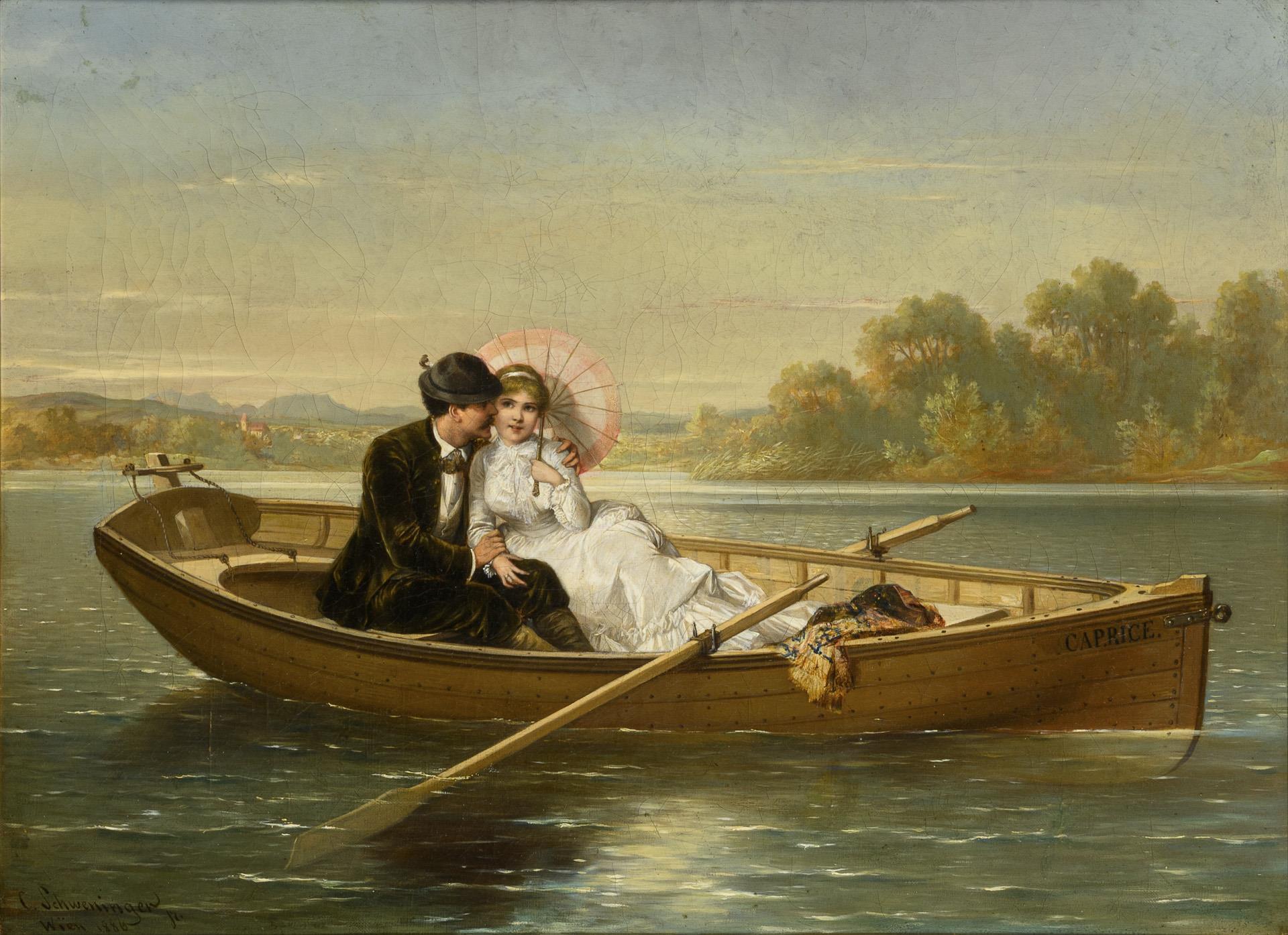 Liebespaar im Kahn in vertraut inniger Zweisamkeit. Das Bild ist erwähnt im Boetticher "Malerwerke des 19. Jahrhunderts", Band II,2 Seite 697, Nr. 28