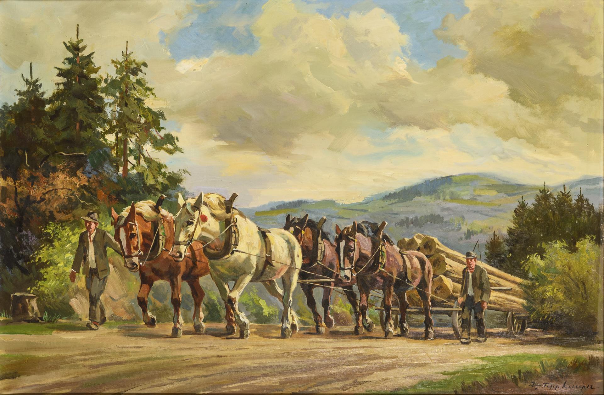 Die zwei Männer mit dem Pferdegespann und dem beladenen Wagen auf einer Straße am Waldrand im Sonnenschein