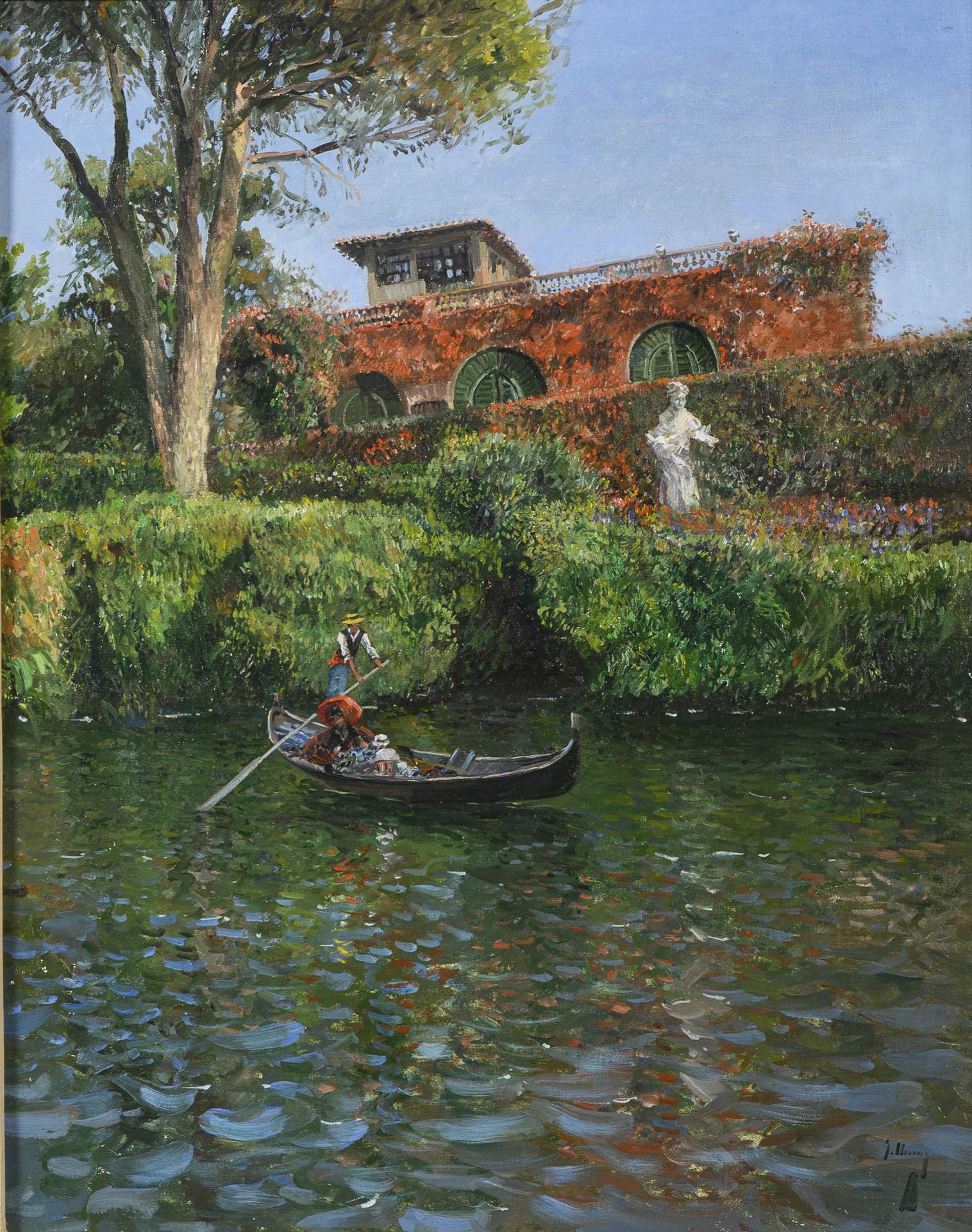 Paar in einer Gondel auf einem Fluss unterhalb einer mit Weinlaub bewachsenen Villa im Sonnenschein
