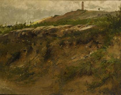 Blick einen Hügel hinauf zu einem Turm unter bedecktem Himmel
