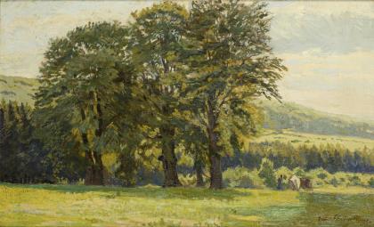 Staffagefiguren nahe einer Baumgruppe auf grüner Wiese in weiter hügeliger Landschaft