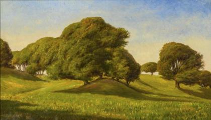 Hügelige Sommerlandschaft mit vereinzelten Bäumen unter blauem Himmel