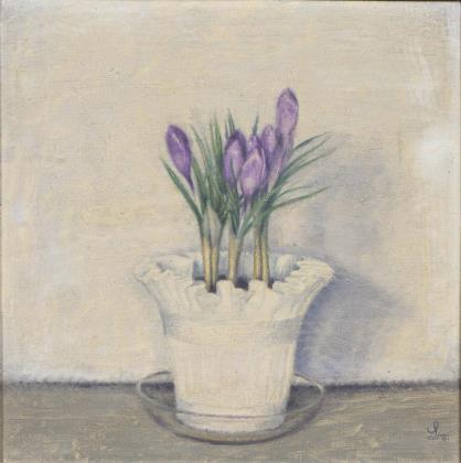 Die Krokusse mit violetten Blüten in weißem Topf vor einer Wand