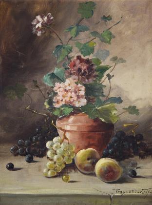 Florales Arrangement mit Trauben und Pfirsichen in großzügiger Malweise und in einer wohlabgewogenen Komposition. Die Gegenstände sind in Raum und Licht überzeugend dargestellt. Originaler Keilrahmen mit Sammlungs-Stempel, originaler vergoldeter Stuckrahmen