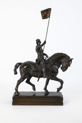 Gerüstete Reiterfigur mit erhobener, wappenverzierter Flagge. Wohl der Heilige Wenzel von Böhmen (Sv. Václav) in qualitätvoller Gussausführung nach der Figur von Josef Vaclav Myslbek (1848 Prag - 1922 ebd.)