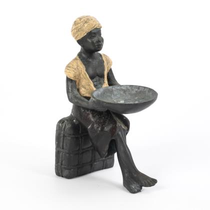 Auf einem senkrecht stehenden, verschnürten Paket sitzende Figur mit Turban, die eine Schale in den Händen hält