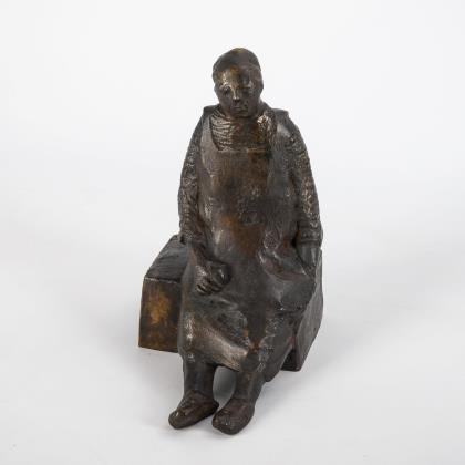 Sitzende Frauenfigur mit ausgestreckten Beinen auf einem Quader; in der rechten Hand hält sie vermutlich einen Ball, die linke ruht in der Schürzentasche