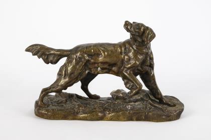 Agiler Jagdhund im schreitenden Vorwärtsgang mit zurückgewandtem Blick, auf einer von Naturelementen verzierten Plinthe