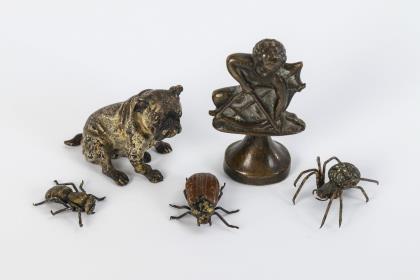 Wiener Bronzen: Bulldogge, Kreuzspinne, Maikäfer und Biene. Petschaft mit figürlichem Sternbild Schütze und Daten (22.XI.-22.XII.); ohne Monogrammgravur