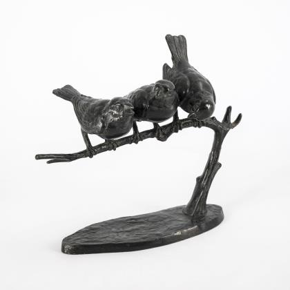 Über annähernd ovaler Bronzeplinthe auf einem Ast sitzende Vögel in unterschiedlichen Posen