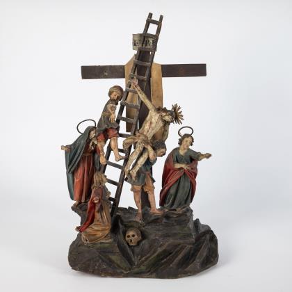Figurengruppe auf einem sockelartigen Felsen mit der Darstellung der Kreuzabnahme Christi. Eine Leiter führt zum Kreuz, das von einem Schild mit den bekannten Initialen "INRI" bekrönt wird. Ein Stofftuch liegt wie eine Stola um den Längsbalken und über den Querbalken. An der Kreuzabnahme sind mehrere Figuren beteiligt: der leblose Christus, Maria, Maria Magdalena, Johannes sowie vermutlich Josef von Arimathäa und Nikodemus