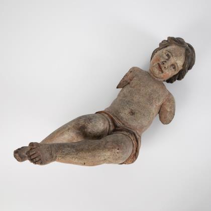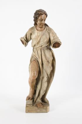 Die geschnitzte Figur stellt möglicherweise eine Heilige oder einen Heiligen dar. Im Kontrapost ruht das rechte Bein locker und unbedeckt vom Gewand auf einem leicht erhöhten Sockel. Der Kopf ist nach links gedreht und blickt mit einem leichten Lächeln nach unten. Die Rückseite ist im Bereich der Beine nicht vollplastisch ausgearbeitet.