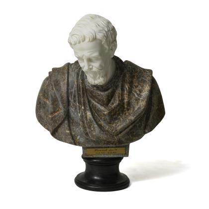 Repräsentative Büste Heinrichs IV., des ersten französischen Königs aus dem Hause Bourbon, mit leicht gesenktem Blick, auf einem schwarzen Rundsockel. Kopf und Hals sind aus weißem Marmor gearbeitet; die Hautpartien sind poliert, während das Haar unpoliert und in rauer Oberfläche belassen wurde. Der Körper hingegen, insbesondere das Gewand, besteht aus einem deutlich dunkleren, marmorierten Stein