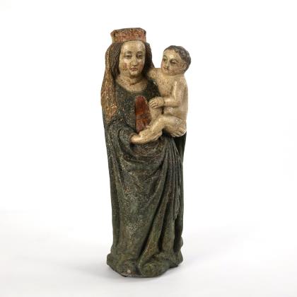 In archaisierender Blockhaftigkeit mit nur leichtem gotischen Schwung stehende Maria, die über ihrer linken Hüfte das nackte Jesuskind trägt, das zärtlich seinen Arm um ihren Hals gelegt hat