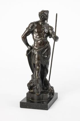 Stehender Krieger in Rüstung mit Schild und Speer, auf einem Sockel mit erlegtem Löwen
