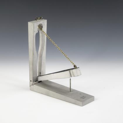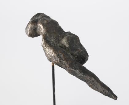 Auf dem Rücken liegender, weiblicher Torso in starker Stilisierung, der auf dem Messingstab über dem Sockel schwebt und frei schwingen kann. Die Löcher auf der Sockelrückseite sind vom Künstler angebracht, der eine Montage an der Wand vorsah. Als Beigabe der erwähnte Katalog in Buchform zum Künstler