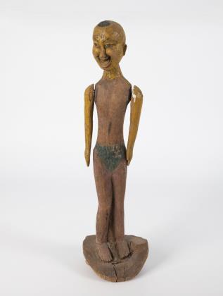 Zusammen mit dem Sockel geschnitzte Figur mit beweglichen Armen und breitem Lachen