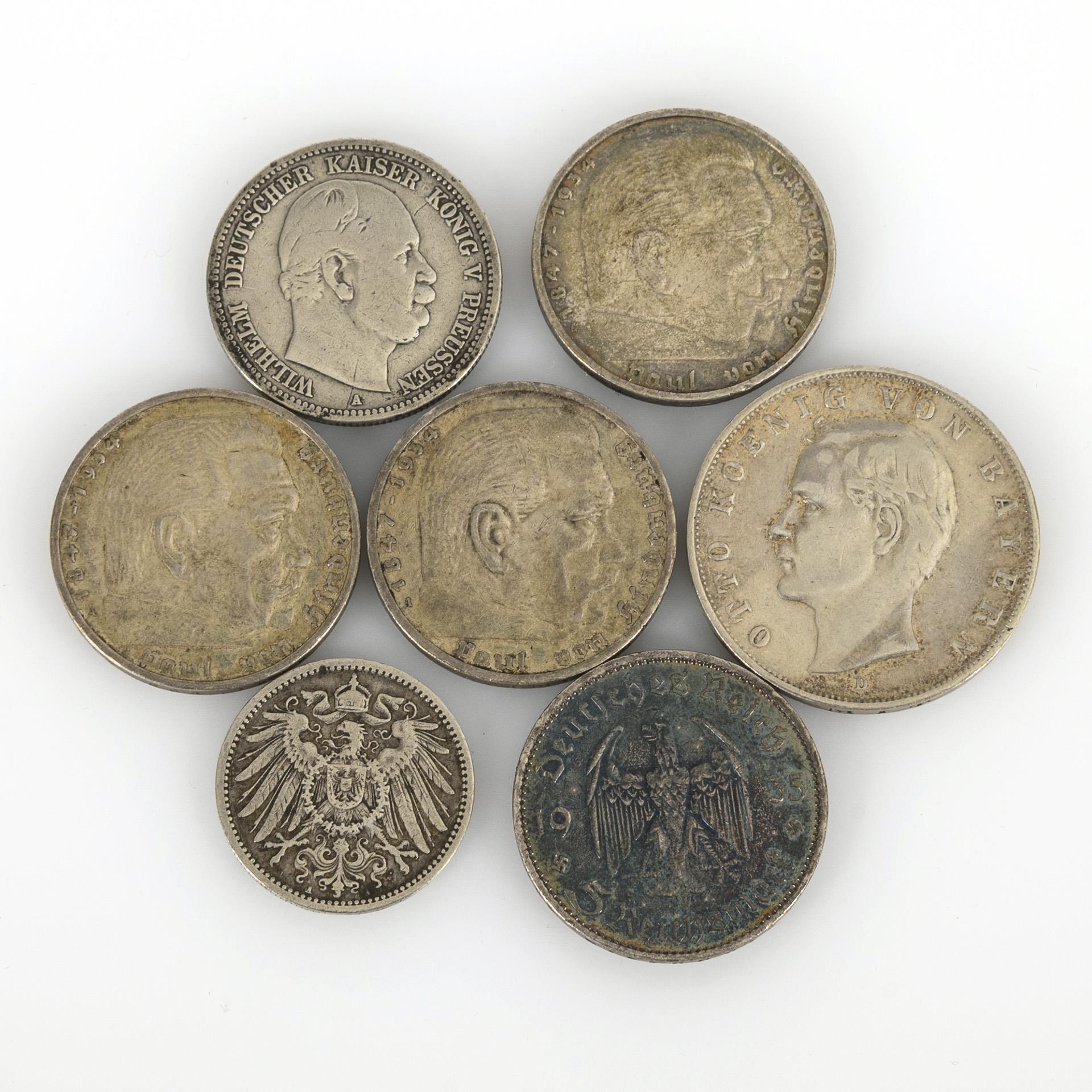 3 Mark, 1908, "Otto Koenig von Bayern", Münzort D. / 3x 5 Mark Deutsches Reich, 1936, Hindenburg. / 5 Mark, 1935, Garnisonskirche Potsdam. / 2 Mark 1876, "Wilhelm Deutscher Kaiser König v. Preussen" / 1 Mark 1893, Münzort A, Zustand: sehr schön