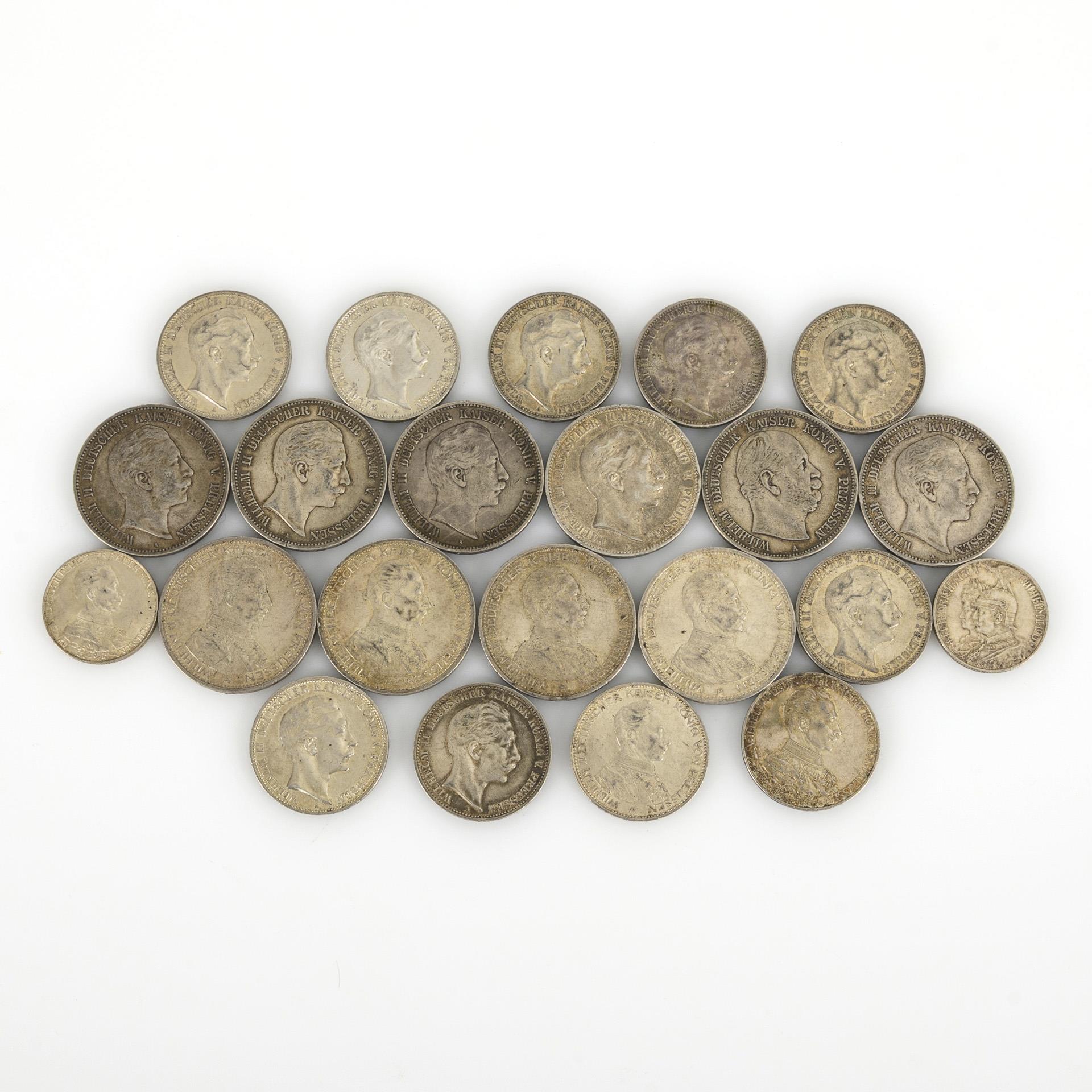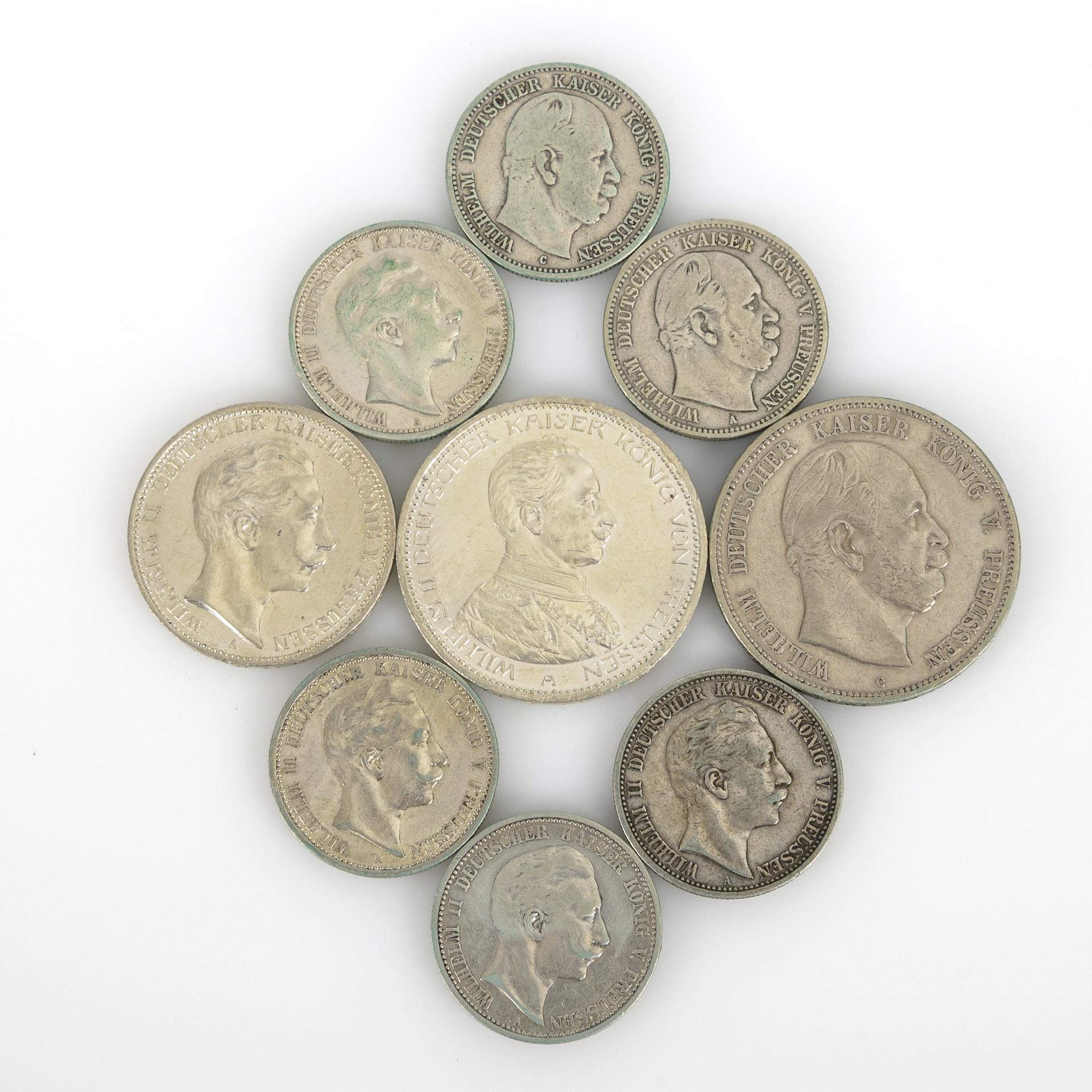 4x 5 Mark: Wilhelm II. in Uniform, davon 3x 1913 und 1x 1914. / 5x 5 Mark "Wilhelm II. Deutscher Kaiser König v. Preussen", 1898, 1902, 1903, 1904, 1907. / 5 Mark "Wilhelm Deutscher Kaiser König v. Preussen", 1876. / 8x 3 Mark, "Wilhelm II. Deutscher Kaiser König v. Preussen", 3x 1910, 2x 1911, 3x 1912. / 3 Mark und 2 Mark: Wilhelm II. in Uniform, zum 35jährigen Regierungsjubiläum 1913. / 3 Mark, Wilhelm II. in Uniform, 1914. / 2 Mark "Friedrich I. 1701 Wilhelm II. 1901", 1901. Alle Münzstätte A