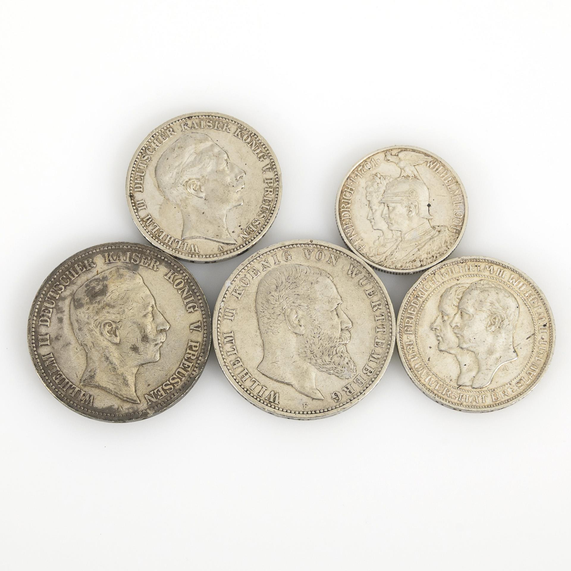 5 Mark, 1904, "Wilhelm II. Koenig von Wuerttemberg", Münzort F. / 5 Mark, 1899, "Wilhelm II. Deutscher Kaiser König v. Preussen", Münzort A. / 3 Mark, 1908, "Wilhelm II. Deutscher Kaiser König v. Preussen", Münzort A. / 3 Mark, 1911, "1811 - 1911 Universität Breslau, Friedrich Wilhelm III. Wilhelm II.", Zustand: fast vorzüglich. / 2 Mark, 1901, "Friedrich I. 1701, Wilhelm II. 1901", Zustand: fast vorzüglich