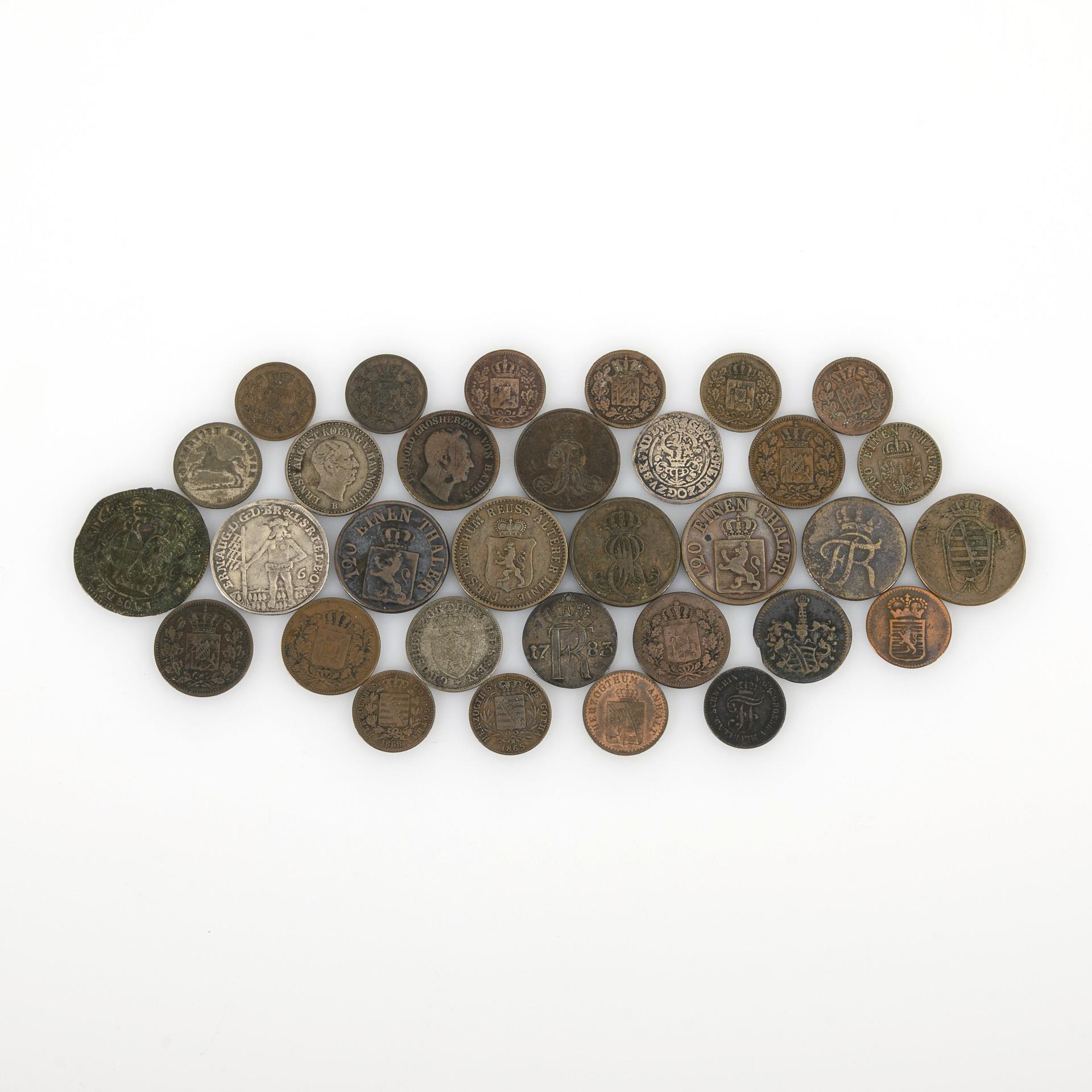 "3 Heller 1846, Kurhessische Scheidemünze", "120 Einen Thaler". / dito 1859. / "3 Pfennige 1898 Scheide Münze", "Fürstenthum Reuss Ältere Linie". / "3 Pfennig 1822", Sächsische Wappen "H.S.C.S.S.M" / "12 Einen Thaler 1720, Nach Chur. Sachs: U. Brand: Korn und Schrot", "Georgius Guilielmus D G M Brandenb." (Georg Wilhelm 1712 - 1726, Brandenburg Bayreuth). / "VI Marien Grosch, Sola ...oual Honesta 1697", "Ern. Aug. D. G. D. Br. & L. S. R. I. El. E. O.", Braunschweig-Lüneburg: Linie Wolfenbüttel. / "2Pfennige 1847", bekröntes Monogramm Königreich Hannover. / "Pfennig 1866, 30 Einen Thaler, Scheidemünze", "Königreich Hannover", Münzort B. / 2x "1 Pfennig, 10 Einen Groschen, Scheide Münze", 165, 1868, "Herzoth. S. Cob. Gotha" Sachsen-Coburg-Gotha. / 10x Bayern: ("2 Pfennig 1864 Scheidemünze", so auch von 1850, 2x 1858 und 6x 1 Pfennig 1842, 1864,1864, 1856, 1871, 1871.) / "6 Kreuzer 1826 Scheidemünze", "Grosherzogthum Hessen" / "1 Pfennig 1872, Hundert Eine Mark, Scheide Münze","V.G.G. Grossh. v. Mecklenb. Schwerin" /