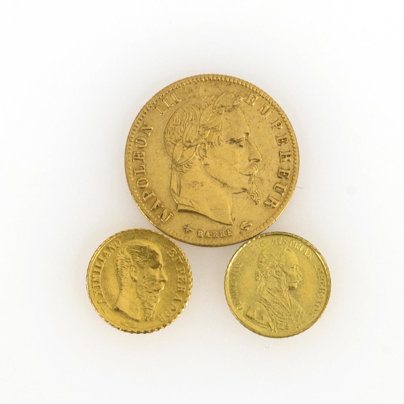 5 Franc 1866, Frankreich, "Napoleon III. Empereur", Münzstätte A, 1,65 g Münzgold / "Maximiliano Emperador", "Imperio Mexicano, 1865", 0,51 g Münzgold, wird auch als wedding token oder Hochzeitsmünze bezeichnet. / "Franc. Ios. I.D.G. Austriae Imperator", Österreich-Ungarn, 1915, 0,41 g, 333 Gold geprüft