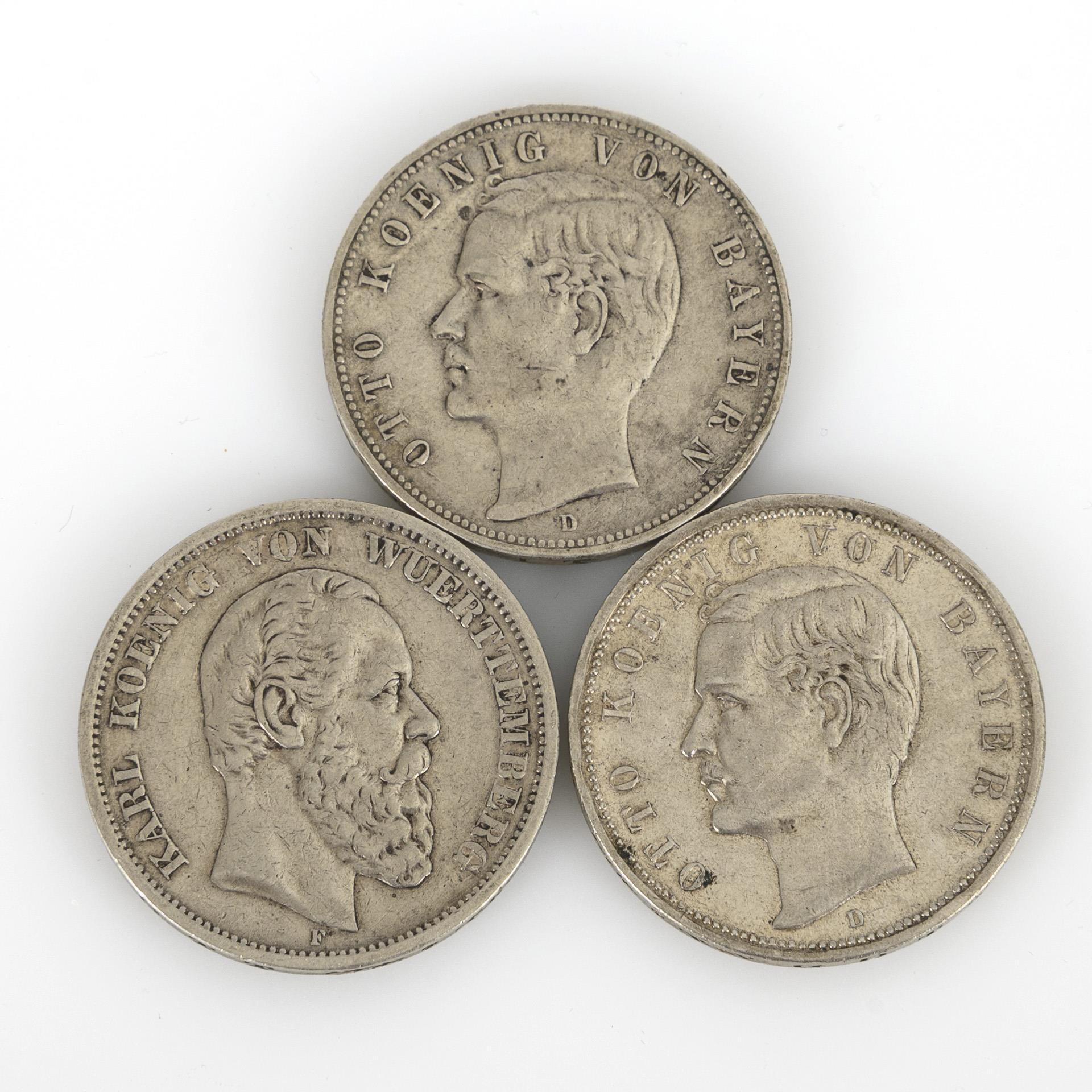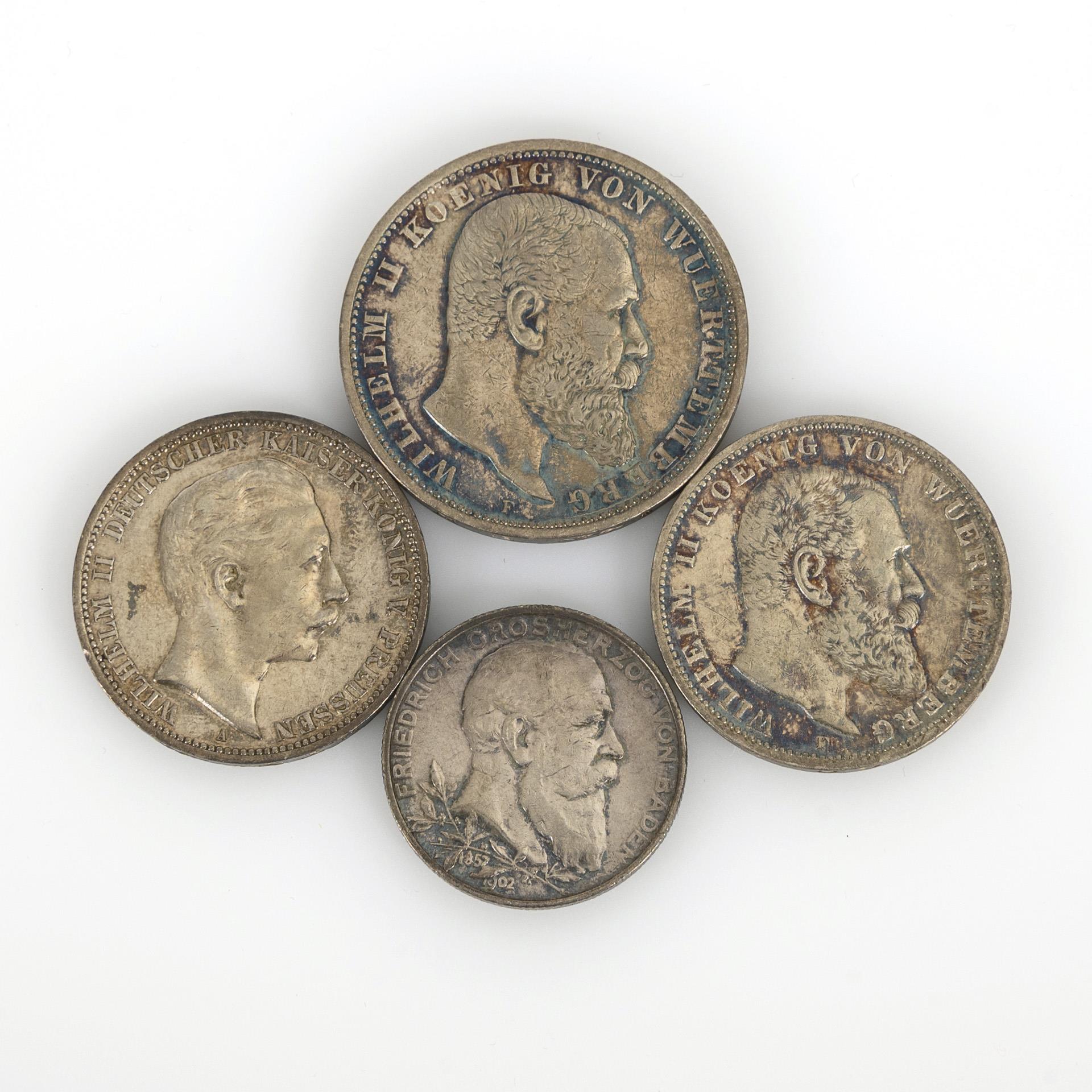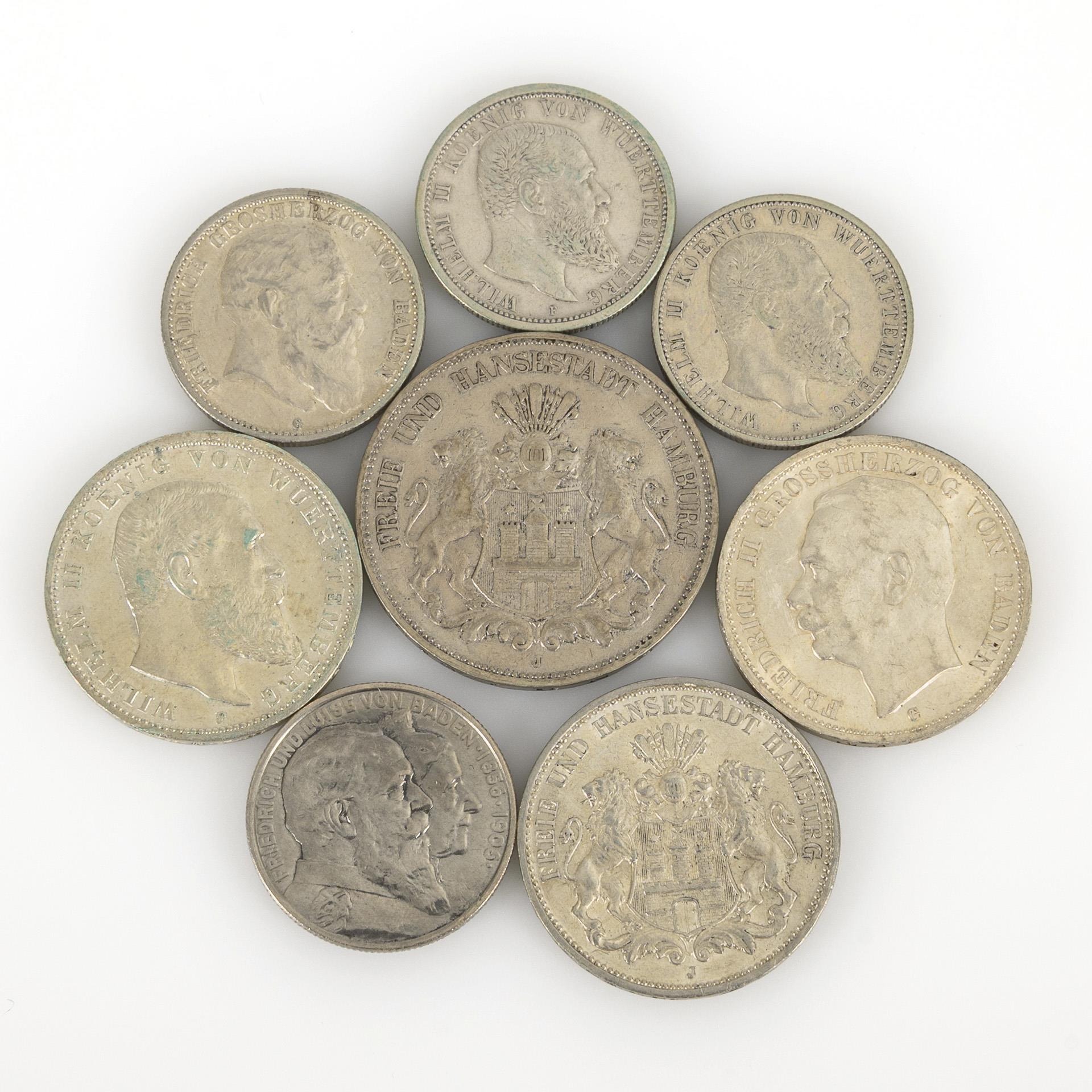 "Freie und Hansestadt Hamburg": 5 Mark 1899; 3 Mark 1911, Münzort J. / "Wilhelm II. Koenig von Württemberg": 3 Mark 1911; 2 Mark 1907; 2 Mark 1900. / 3 Mark 1914, "Friedrich II. Grossherzog von Baden", 2 Mark 1907, "Friedrich Grossherzog von Baden"; 2 Mark 1906, "Friedrich und Luise von Baden 1856 - 1906"