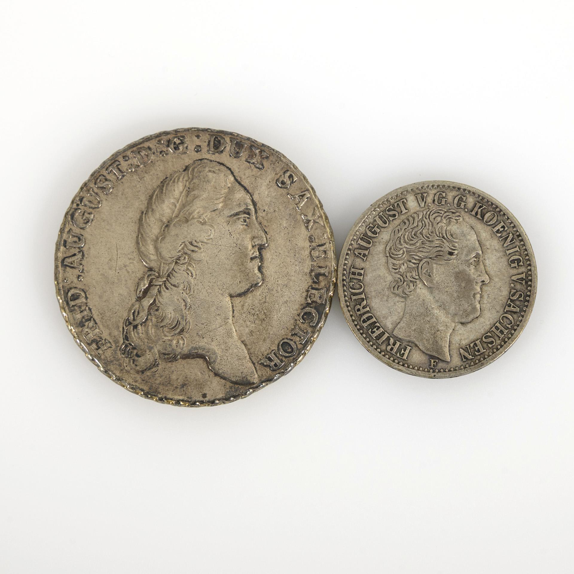 Konventionstaler Sachsen 1788, Friedrich August III ( I.), (1763-1806). "Frid: August: D: G: Dux Sax: Elector", "X Eine Marck", 27,8 g Silber, Zustand: sehr schön, mit zwei Abriebstellen am Rand von früherer Fassung. / 1/3 Thaler Sachsen, 1854, "Friedrich August V.G.G. Koenig v. Sachsen", "42 Eine F. Mark, 3 Einen Thaler", 8,23 Silber