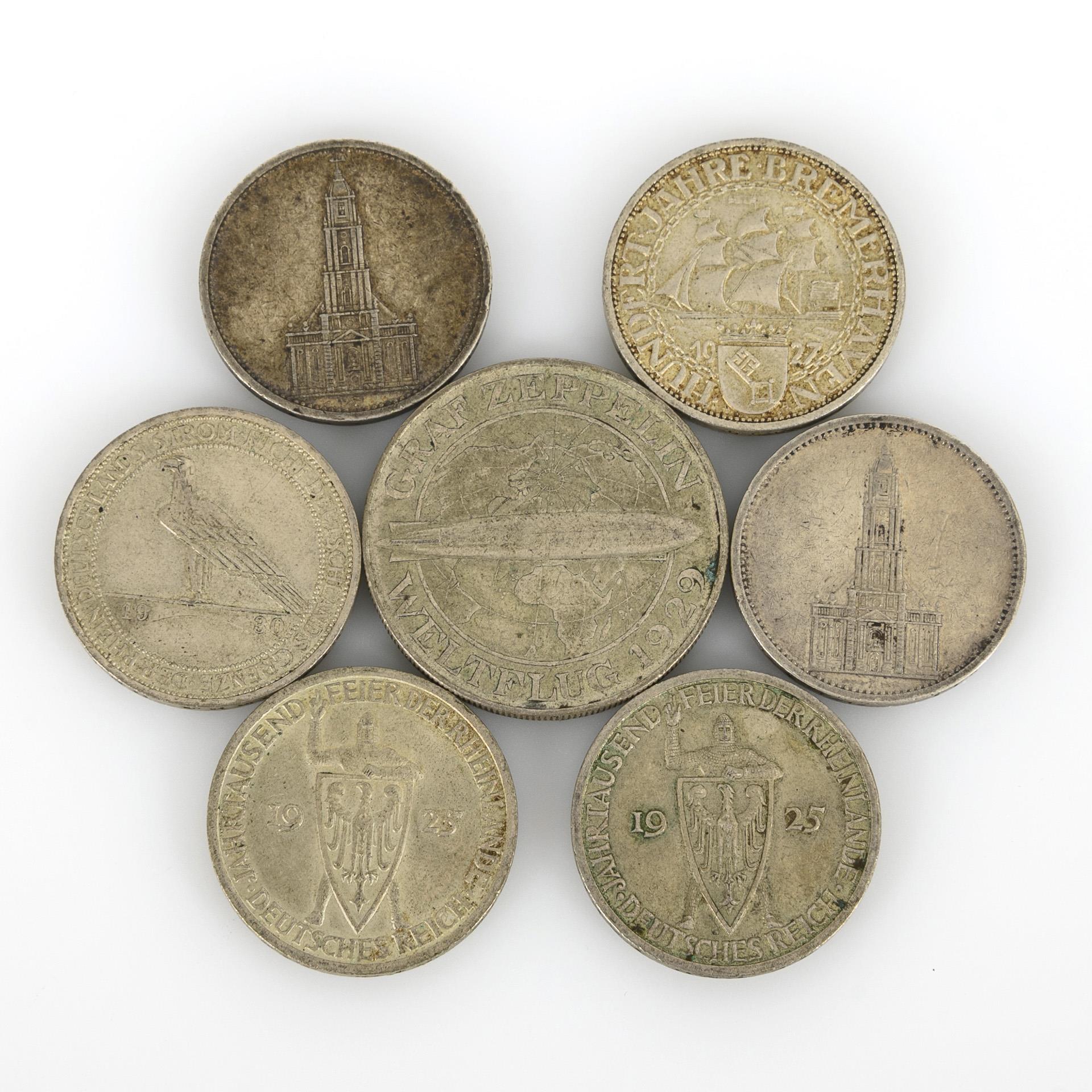 5 Reichsmark 1930, "Graf Zeppelin Weltflug 1919", geriffelter Rand. / 2x 3 Reichsmark, 1925, "Jahrtausenfeier der Rheinlande" Ritter auf ein Schild gestützt. Münzort A. / 2x 5 Reichsmark 1934, 1935, mit der Garnisionskirche Potsdam. / 3 Reichsmark "100 Jahre Bremerhaven", 1927, Münzort A. / 3 Reichsmark 1930, "Der Rhein Deutschlands Strom ..."