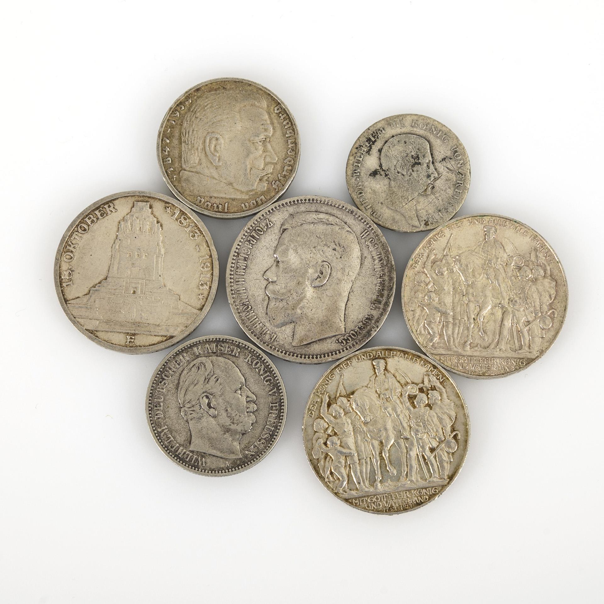 Rubel 1896, Russland, Profil des Zaren mit kyrillischer Umschrift. / Deutsches Reich: 3 Mark 1913, "18. Oktober 1813 - 1913", Münzort E. / 2x 3 Mark, 1913, "Der König rief und alle, alle kamen" / 5 Mark Deutsches Reich, 1936, Hindenburg. / 2 Mark, 1876, "Wilhelm deutscher Kaiser König v. Preussen", Münzort A. / "Vier und achtzig Eine Feine Mark", "6 Einen ReichsThaler 1813", "Friedrich Wilhelm III. Koenig von Preussen"