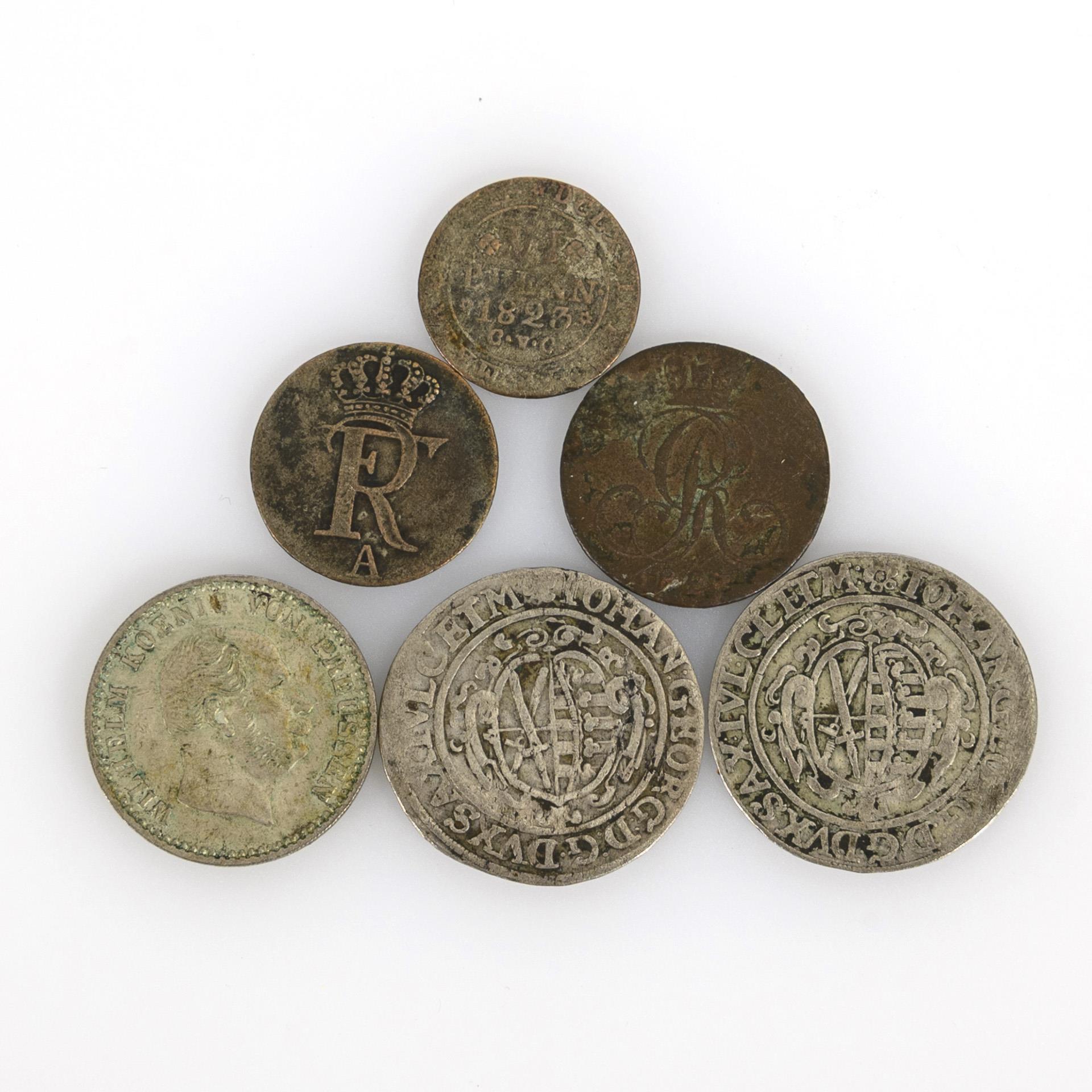 2x 1 Groschen Sachsen, "Johann Georg D G Dux Sax Iul Cl et M", 1625 und 1626, Zustand: sehr schön+ / 2 1/2 Silbergroschen 1864, "Wilhelm Koenig von Preussen", Münzstätte A, Zustand: sehr schön - vorzüglich. / 48 einen Thaler 1776, bekröntes Monogramm FR, Münzstätte A, Kupfermünze, Zustand: vorzüglich. / I Pfennig Scheidemünze, Hannover, 1827, Kupfer, Zustand: sehr schön. / "VI Pfenn 1823 C.v.C.", Braunschweig, Zustand: fast sehr schön
