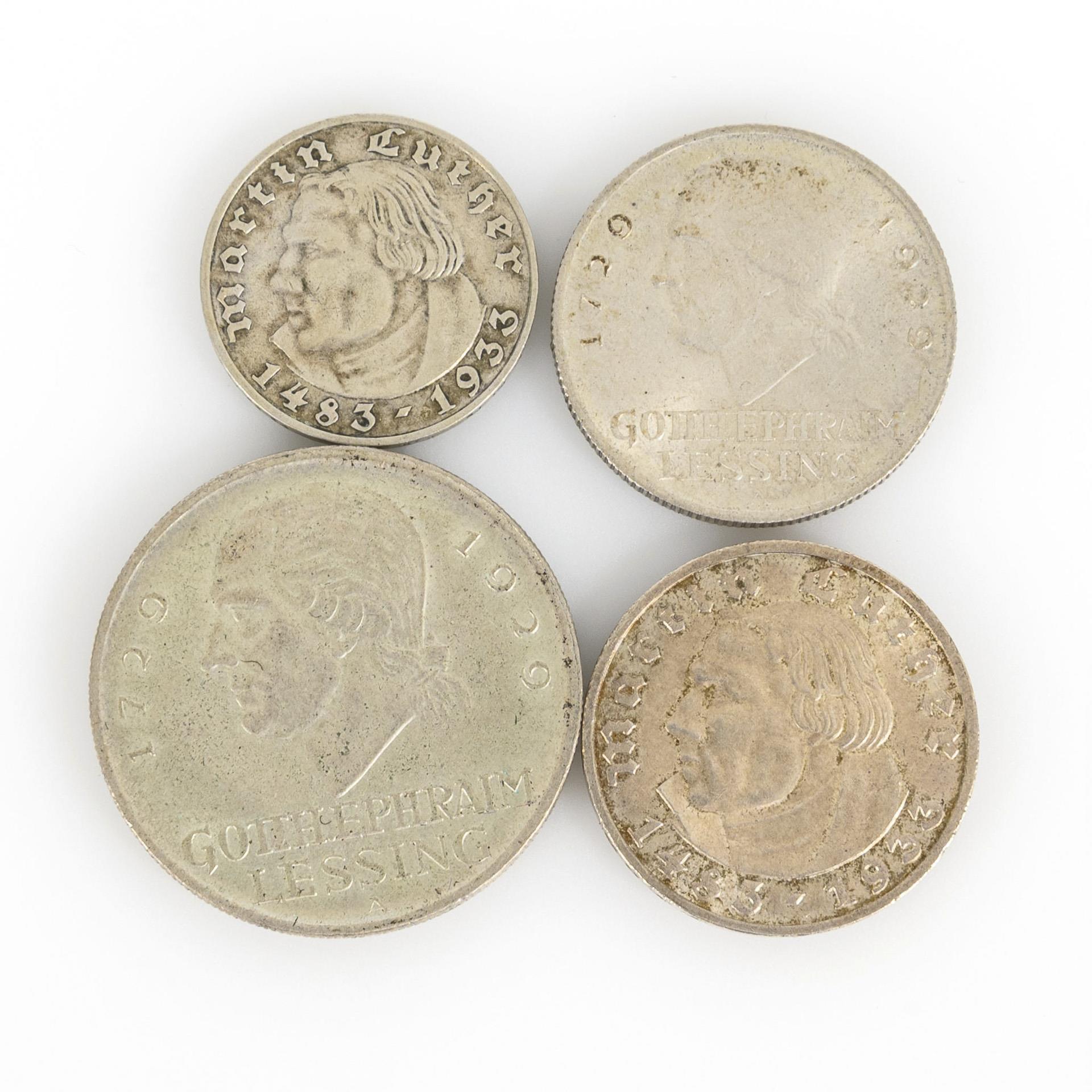 5 Reichsmark "Gotth. Ephraim Lessing 1729 - 1929", geriffelter Rand, Münzort A. / ebenso 3 Reichsmark / 3 Reichsmark "Martin Luther 1483 - 1933", Rand: "Ein feste Burg ist unser Gott" / ebenso 2 Reichsmark