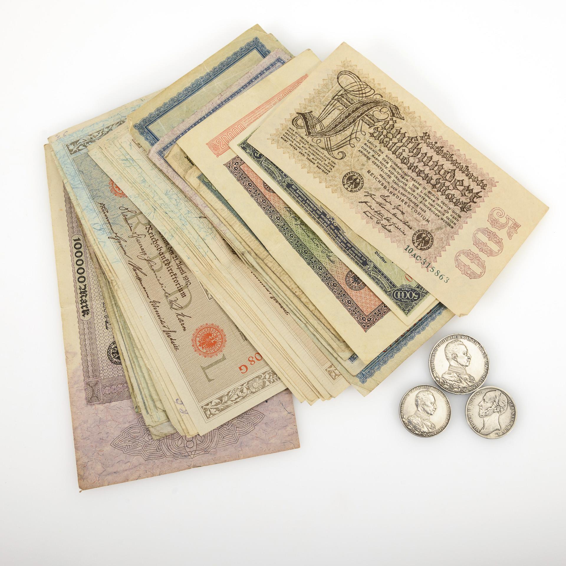 Geldscheine im Wert von 20 Mark bis 500 Millionen Mark, von 1910 - 1923, Deutschland, Inflationsgeld mit Nutzungsspuren. / 2 Silbermünzen: 3 und 2 Mark, 1913, Deutsches Reich, "Wilhelm II. Deutscher Kaiser König von Preussen, 1888 - 1913", in Uniform, zusammen 27,78 g Silber. / 1 Gulden, 1844, "Willem II. Koning der Ned. G.H.V.L.", "Munt Van Het Koningryk Der Nederlanden", 9,75 g Silber