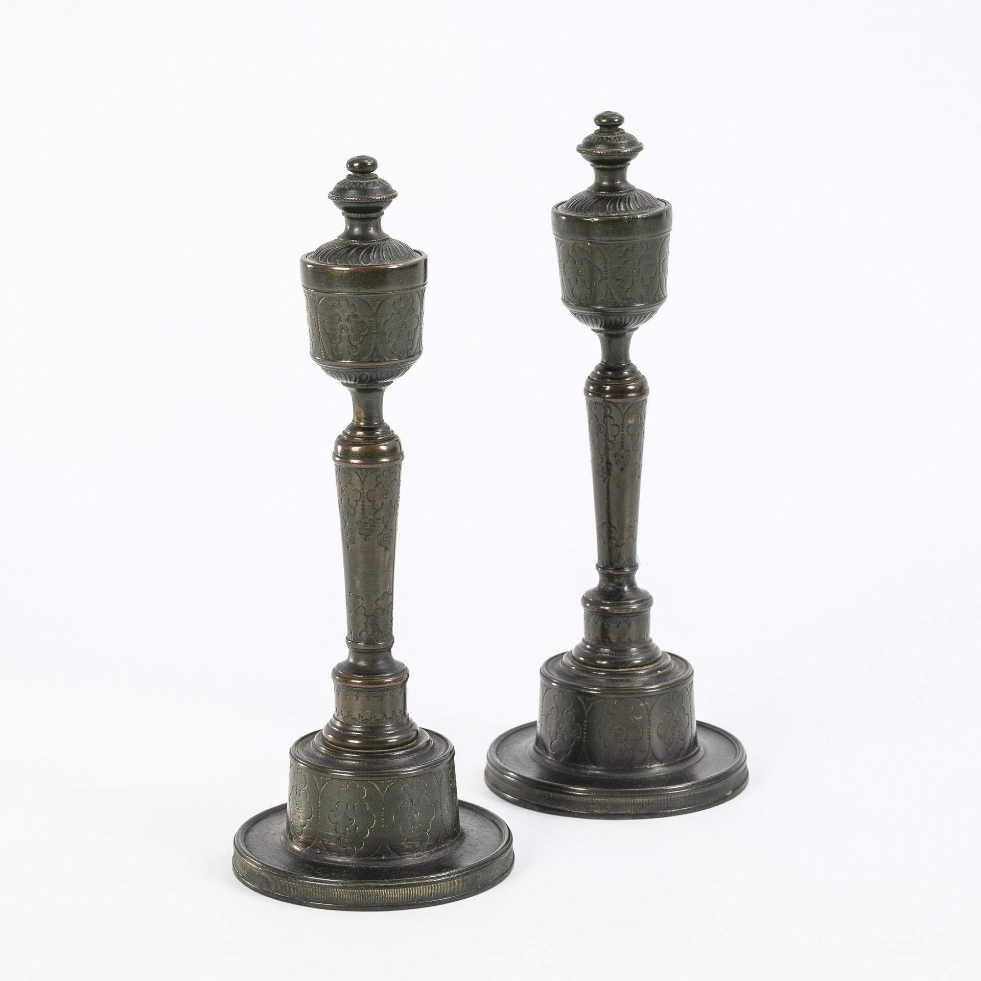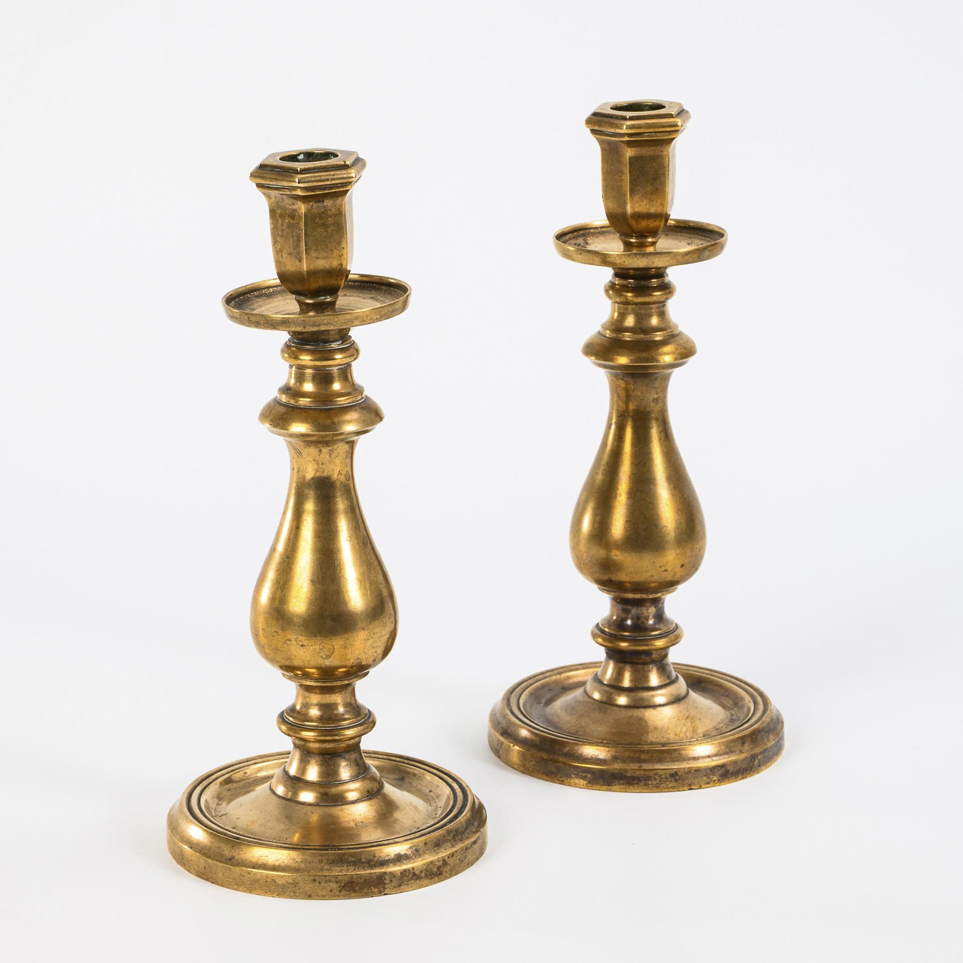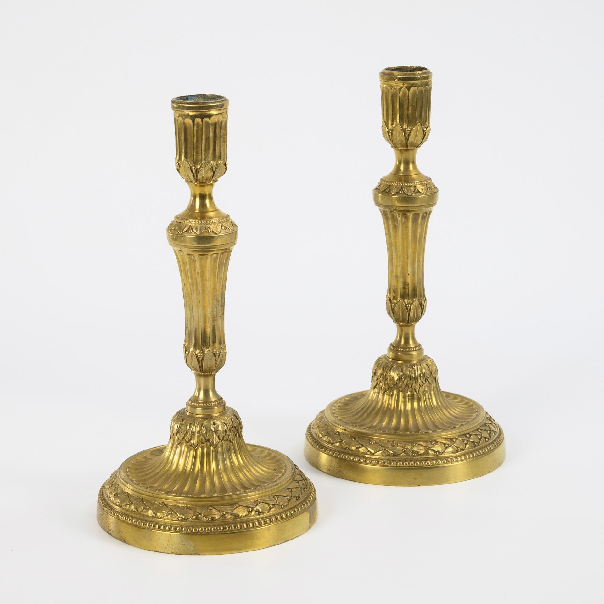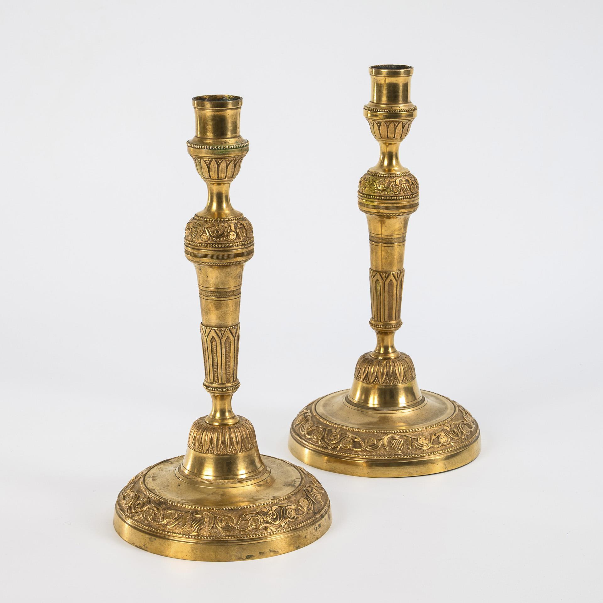 Einflammige Leuchter mit guillochierten Verzierungen auf Rundfuß. Patinierter und kannelierter Mittelschaft und originale Tropfteller